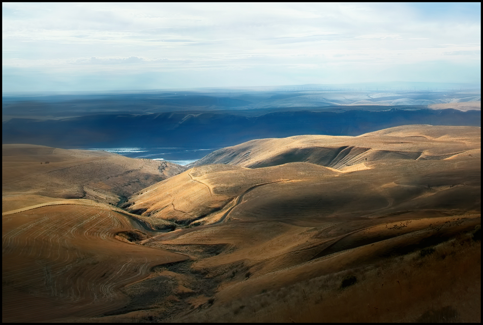 Heading West along the Columbia River, we come to Maryhill, Washington (this side), where the Sam Hill Memorial Bridge crosses over to Biggs, Oregon. You can see the little ribbon that is Highway 97 headed South in the upper right hand corner. Hill was a Railroad icon and Maryhill is named for both his wife and his daughter. Orchards and vinyards do very well close to the river. Interstate 84 is the freeway along the Oregon side.